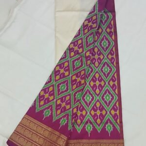 Off white & deep purple Kanchi border double warp pattu saree with ikkat weaving pallu and blouse