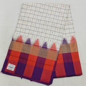 Off white small checks with purple and orange checks border double warp pattu saree ( Deep violet pallu and blouse with full ikkat weaving )