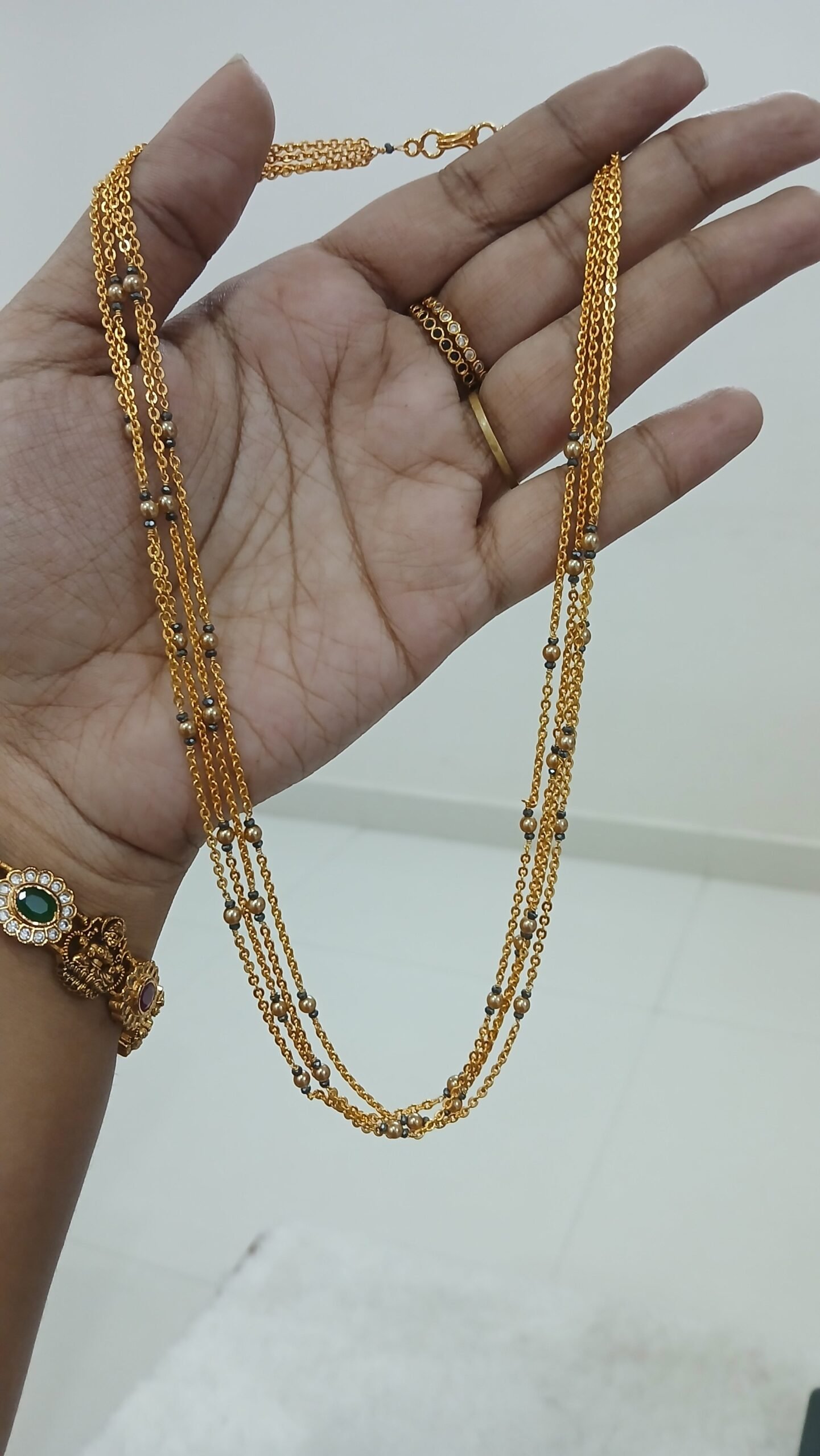 Be the first to review “4 Lines chandraharam with kattutheega golden swarouski and blackdiamonds (18 inches)” Cancel reply