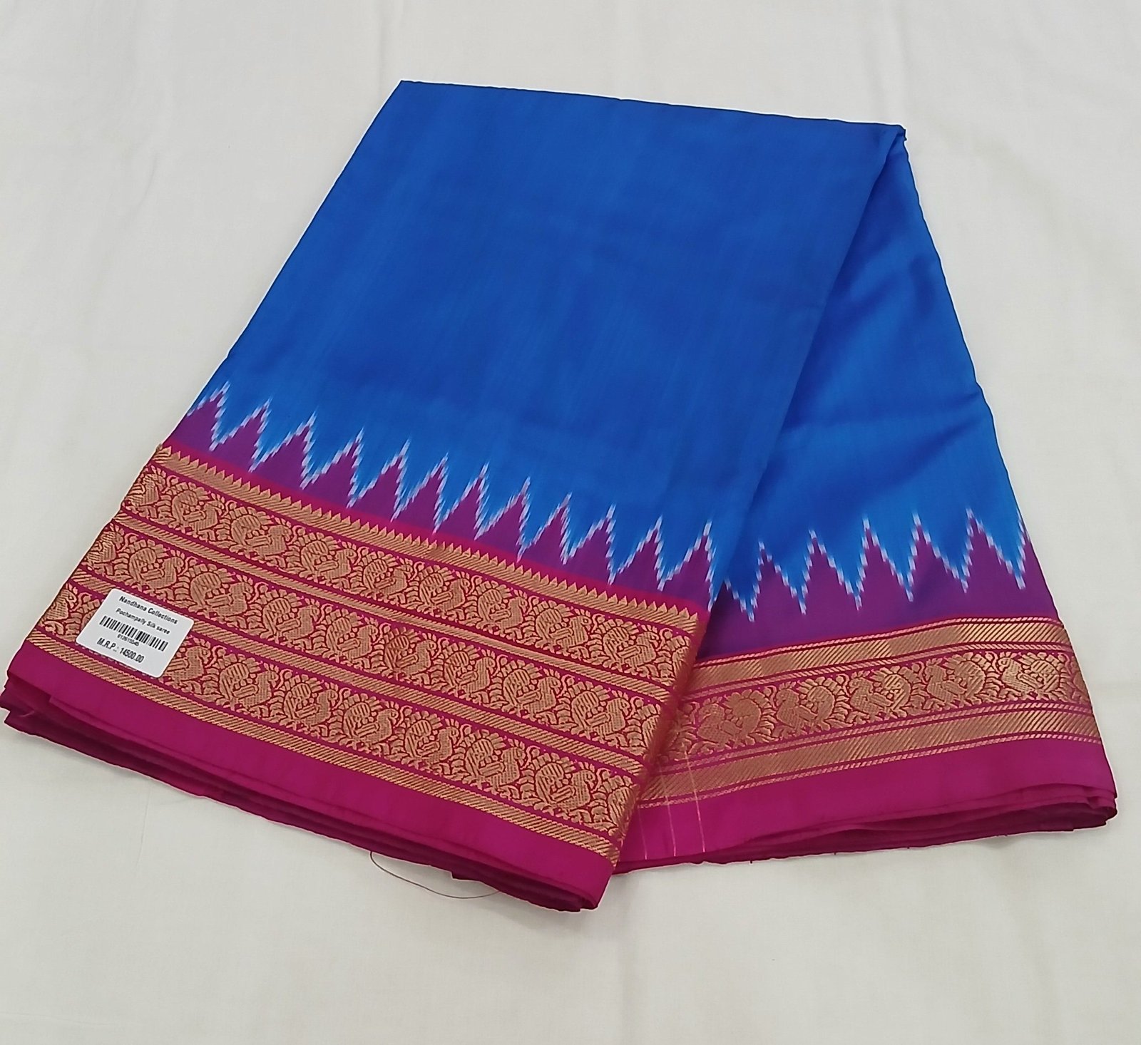 Be the first to review “Blue ( Peacock blue ) & rani pink Kanchi border double warp pattu saree with ikkat weaving pallu and blouse” Cancel reply