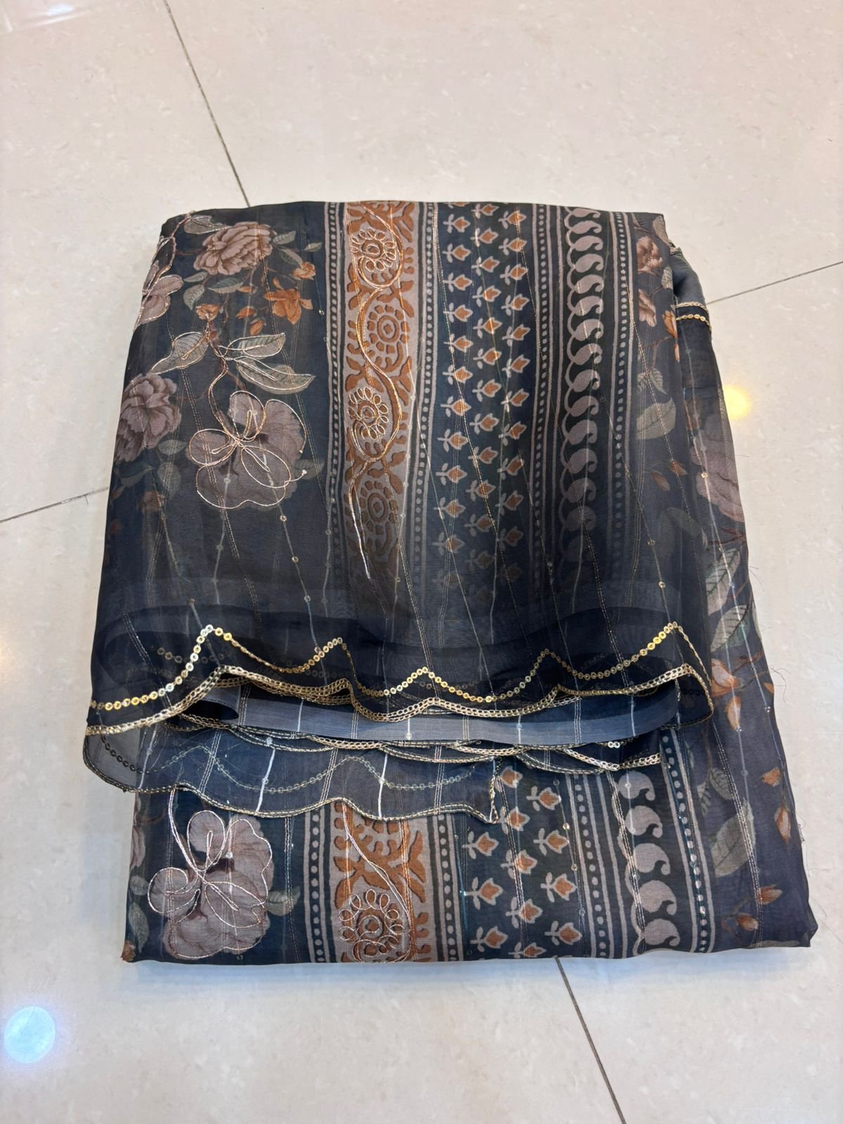 Be the first to review “Dark grey with floral print fancy semi organza saree”