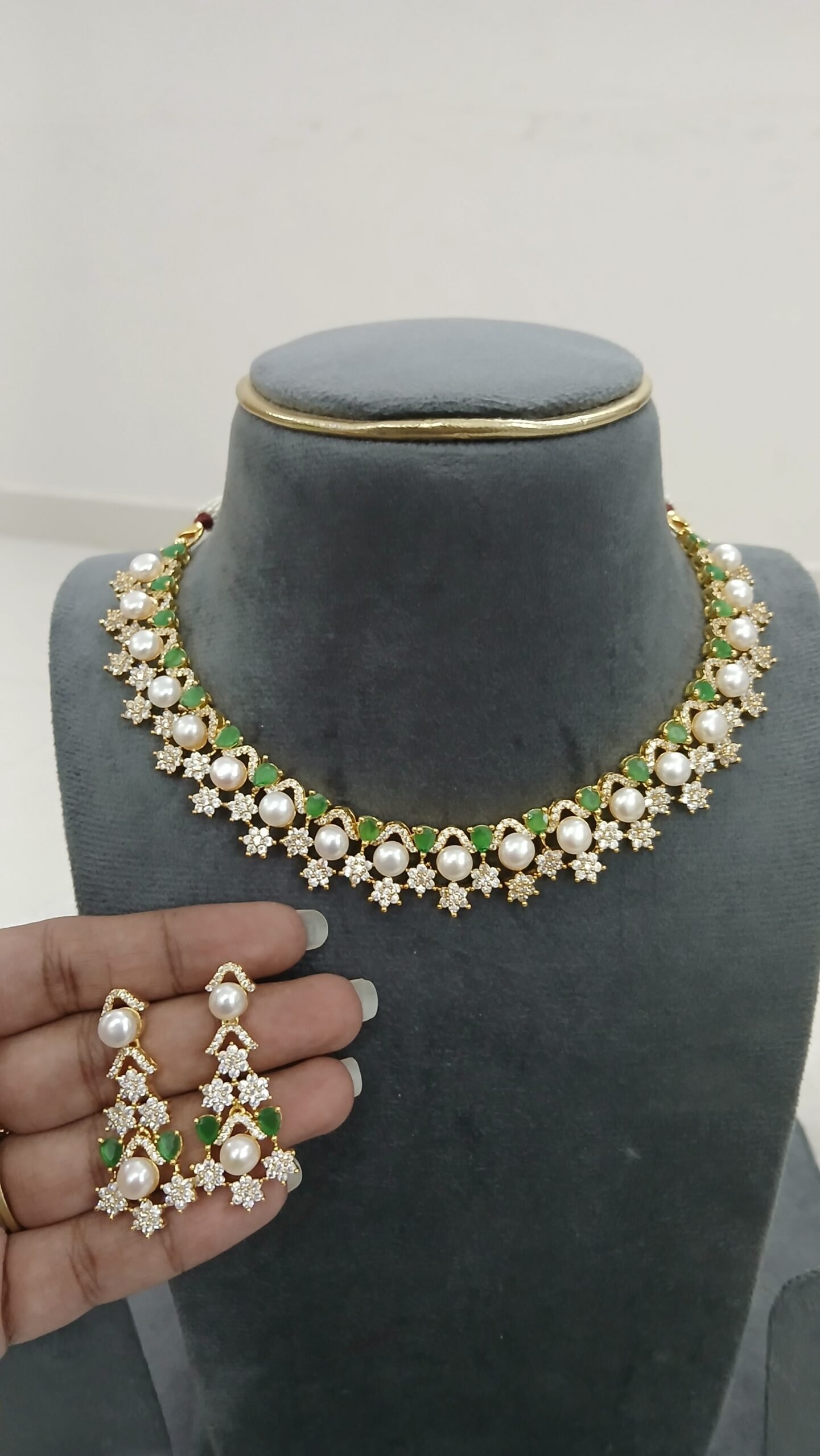Diamond copy neck set with real pearls (GREEN)
