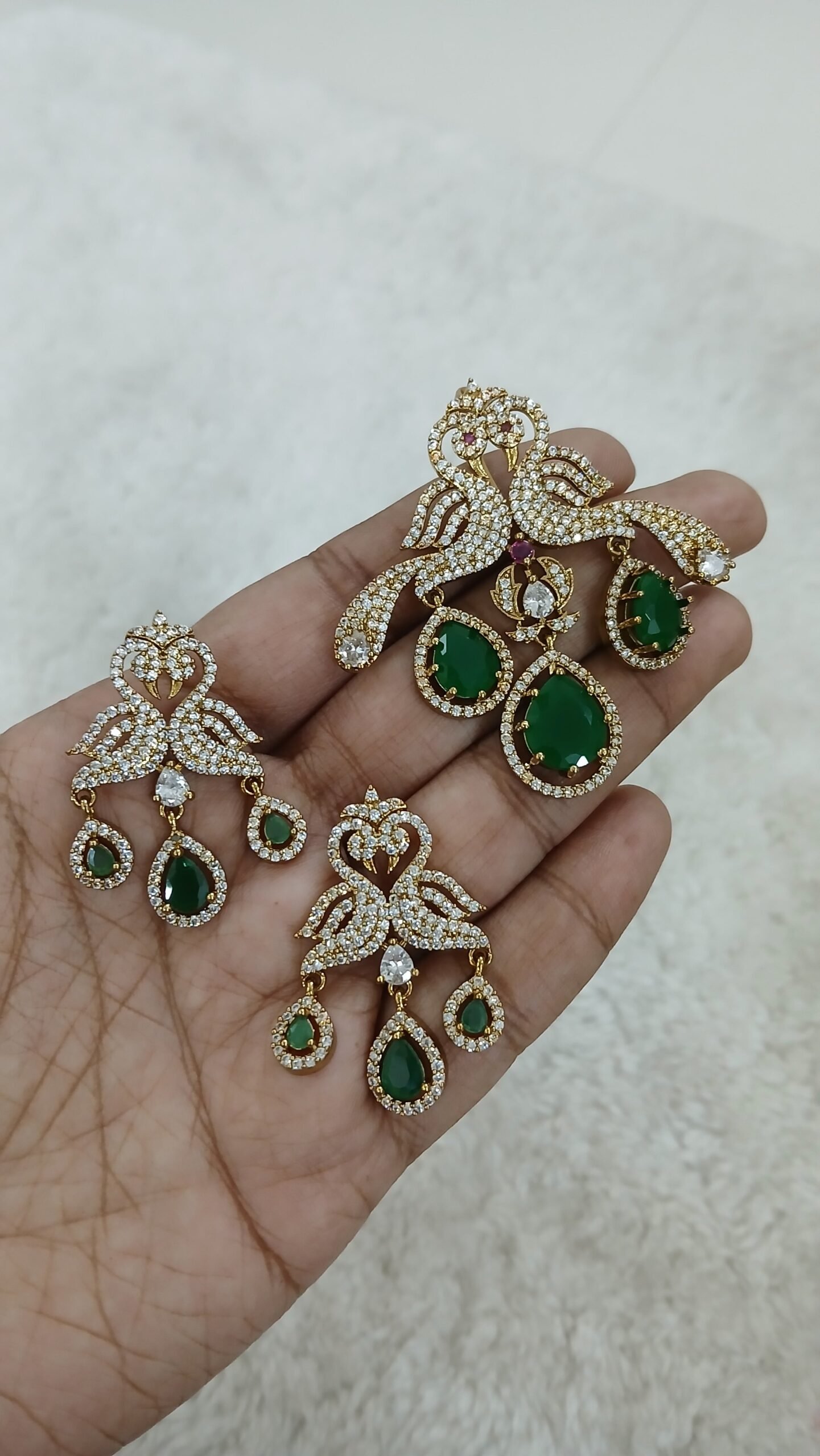 Be the first to review “Double Peacock diamond copy pendant with earrings (GREEN)”