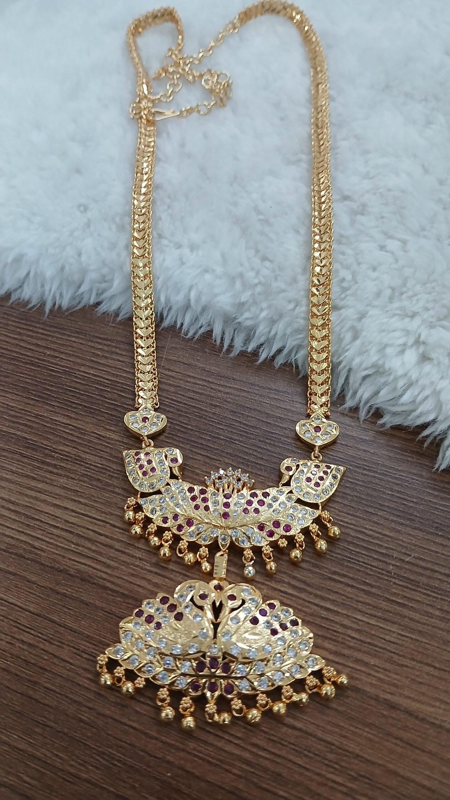 Be the first to review “Double swan Long Micropolish raani haaram(White & pink stones)”