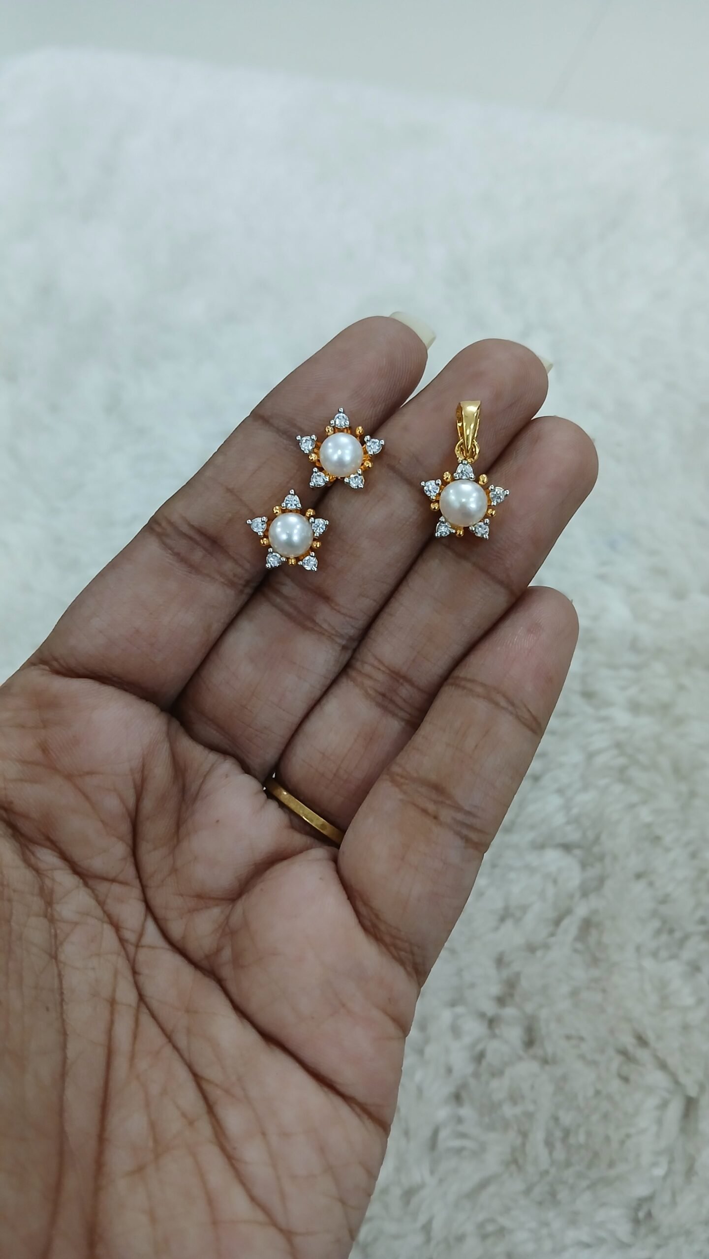 Be the first to review “Flower pattern Diamond copy pendant and earrings with real pearl” Cancel reply