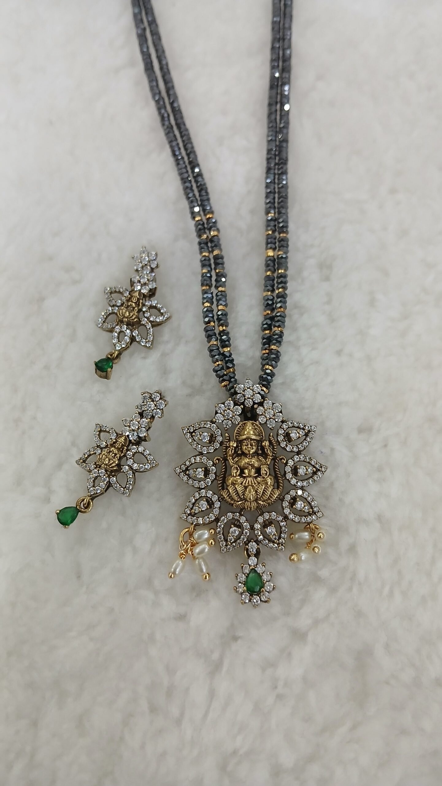 Be the first to review “GREEN Lakshmi pendant set with black diamonds” Cancel reply