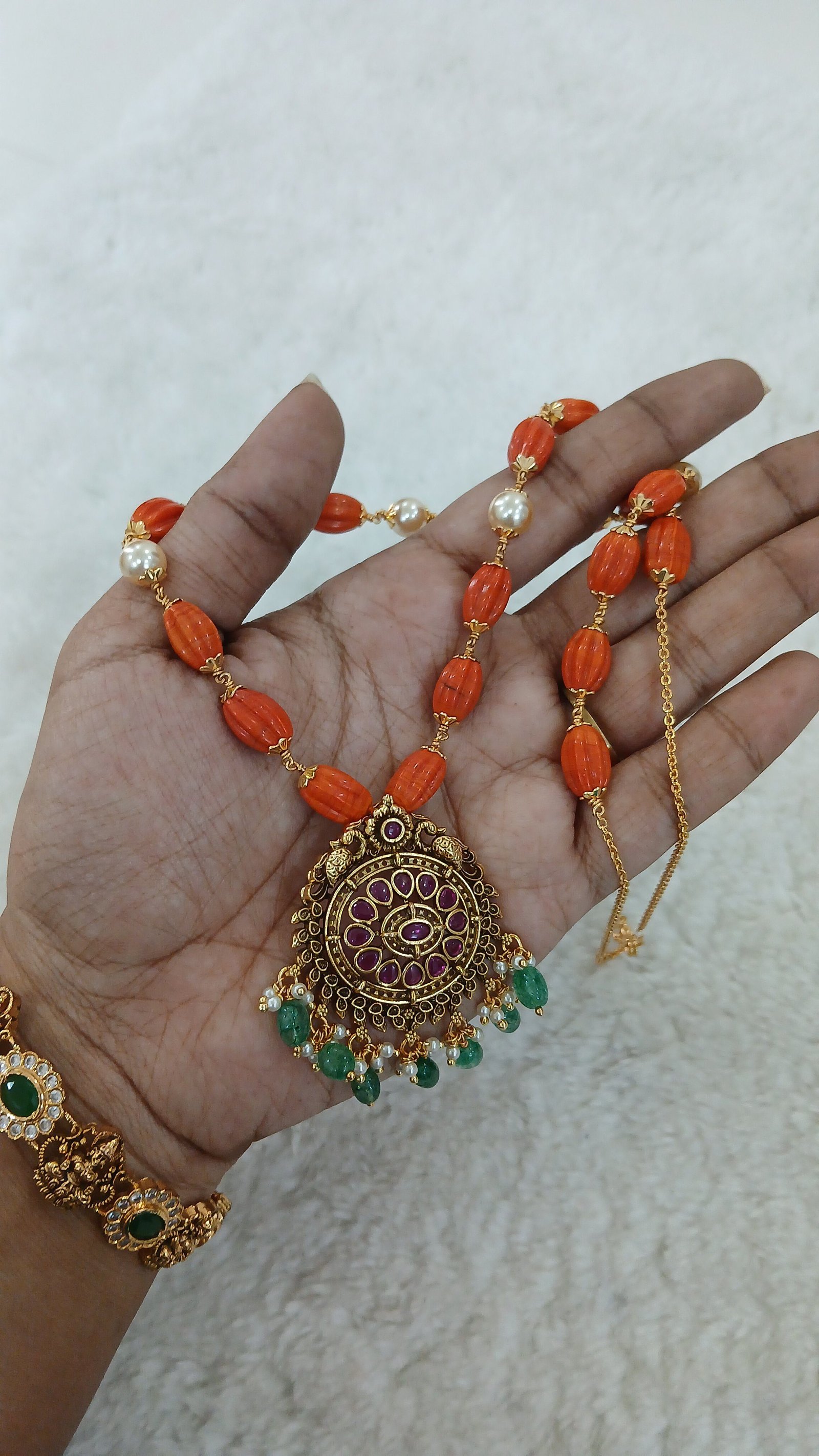 Be the first to review “Long coral chain with nakshi pendant ( kattu theega)” Cancel reply