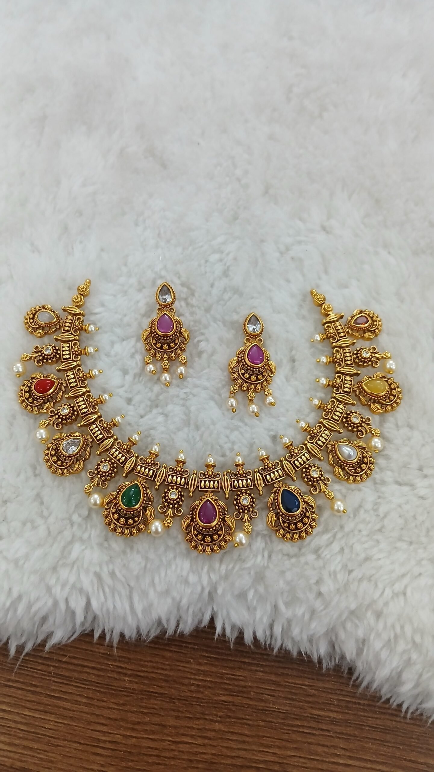 Be the first to review “Navaratna drop shape nakshi set with earrings” Cancel reply