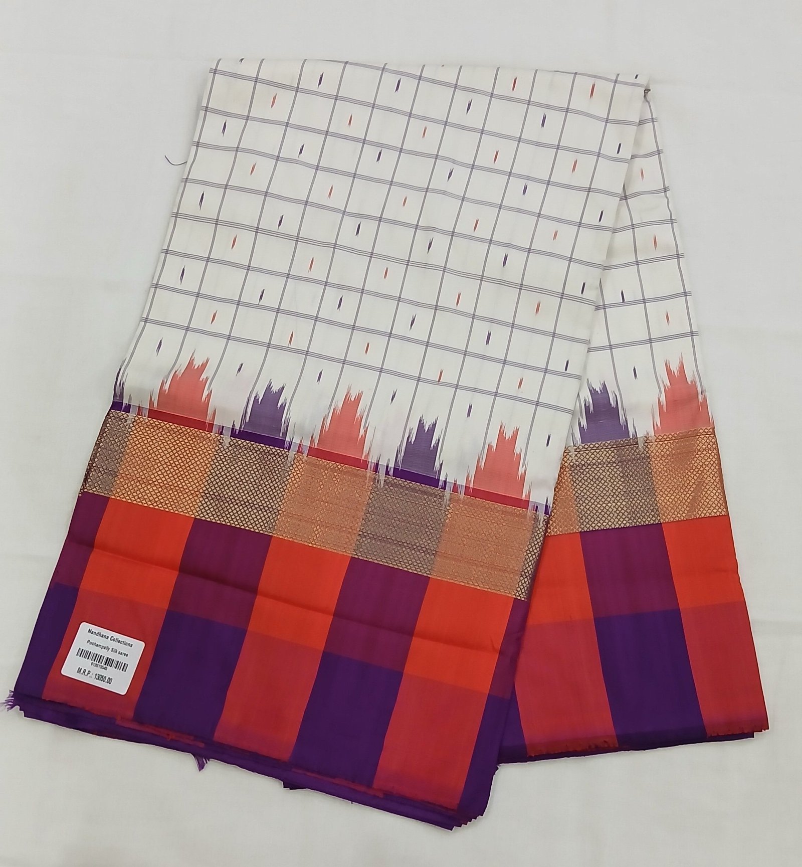 Be the first to review “Off white small checks with purple and orange checks border double warp pattu saree ( Deep violet pallu and blouse with full ikkat weaving )” Cancel reply