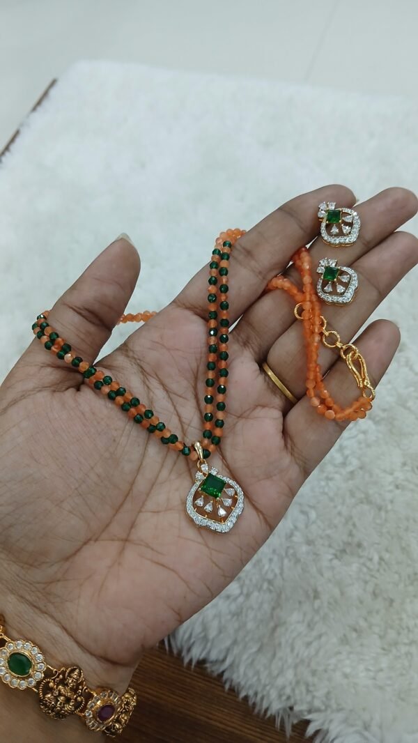 Be the first to review “Orange beads chain with diamond copy pendant & earrings” Cancel reply