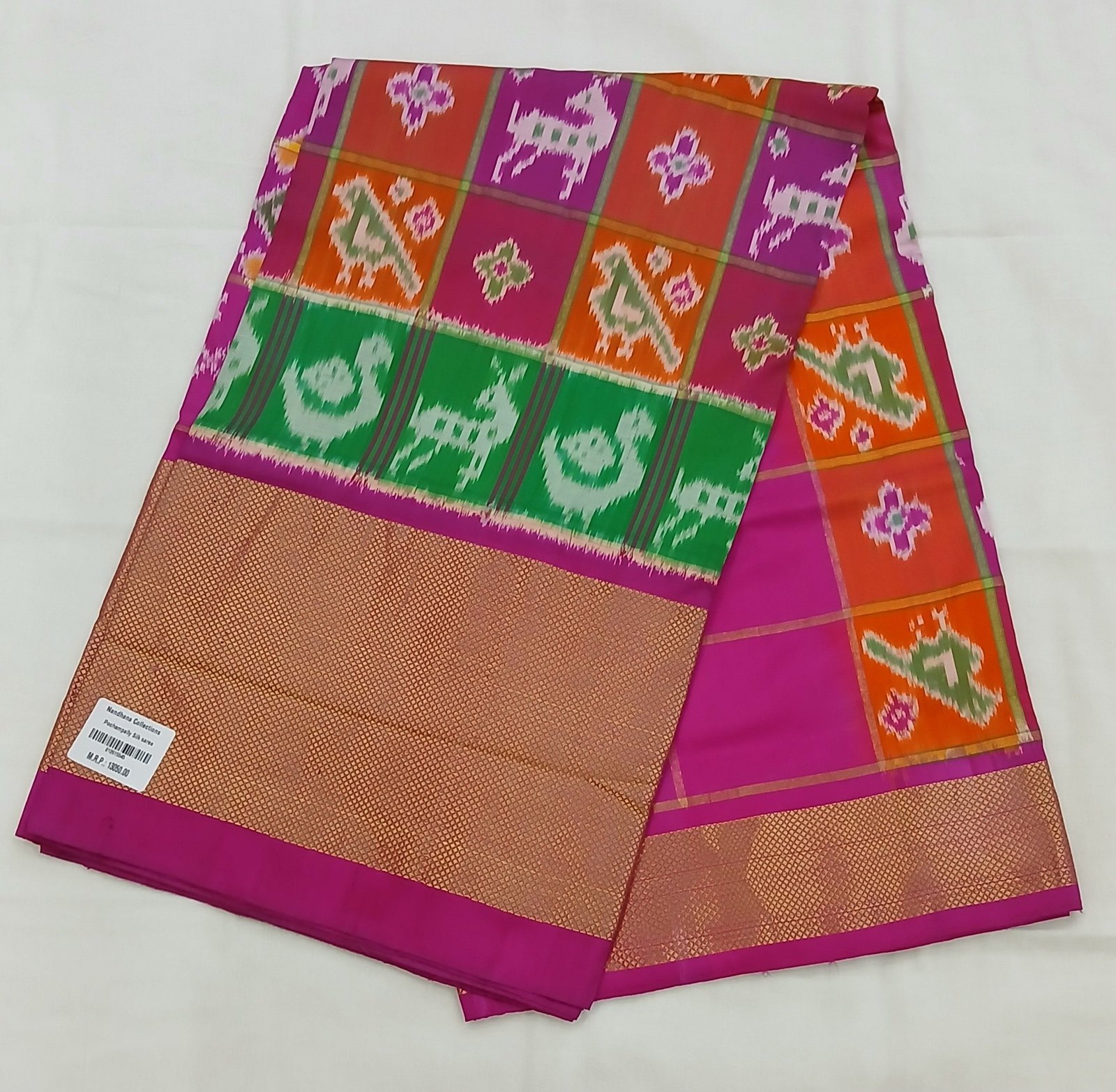 Be the first to review “Parrot & deer ikkat weaving box pattern with pink heavy zari border double warp pattu saree ( with big zari checks blouse and full ikkat weaving pallu )” Cancel reply