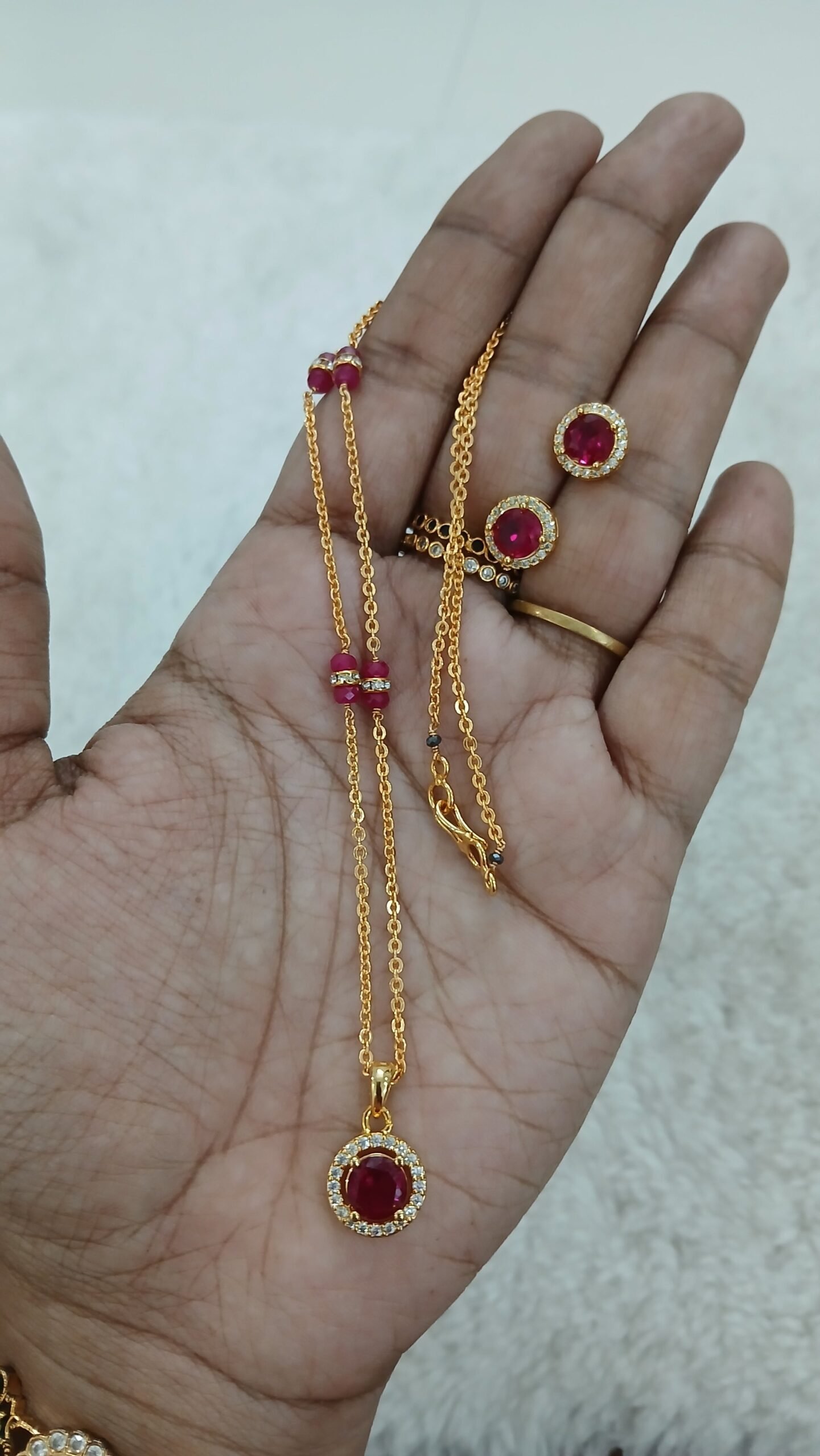 Be the first to review “Pink stone pendant & earrings with simple chain”