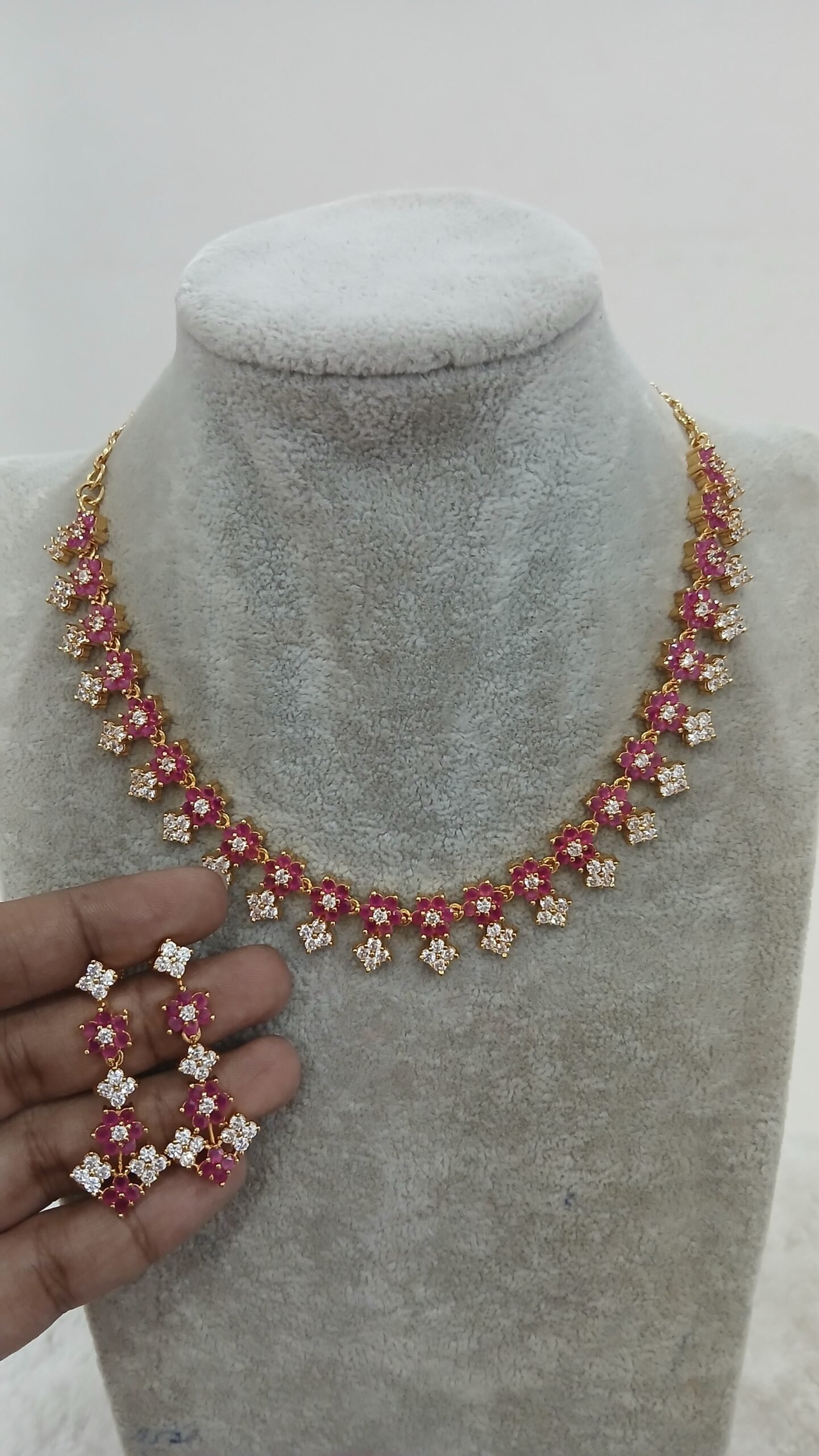 Pink & White stones flower neck set with earrings