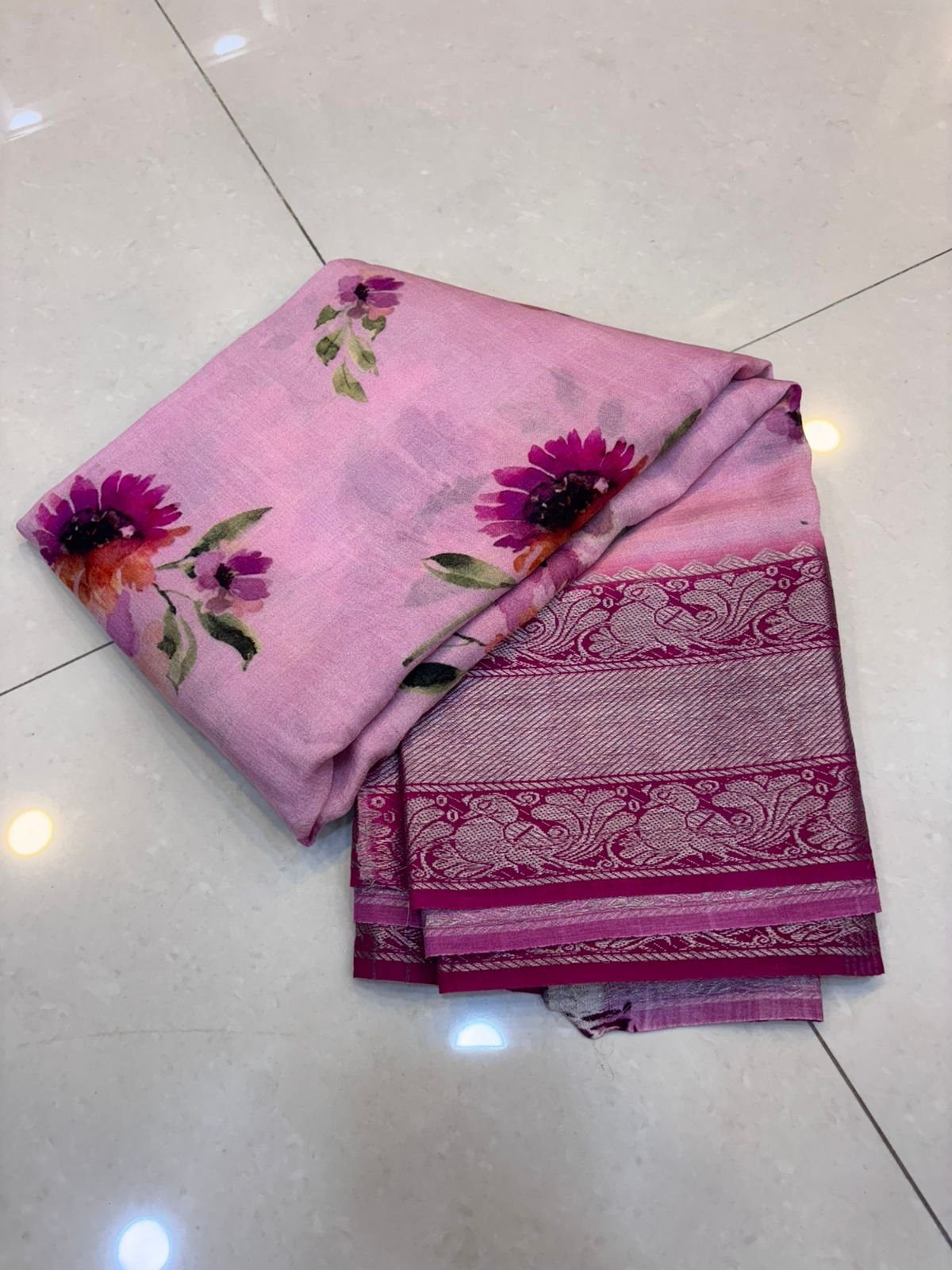 Pink with floral theme digital print pure pattu Mangalagiri saree