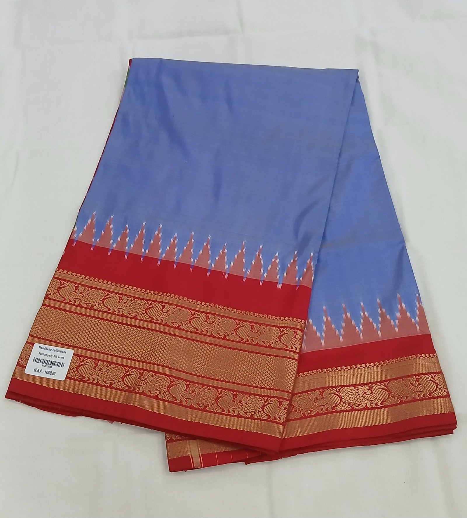 Be the first to review “Powder blue ( Kalanetha ) and red kanchi border double warp pattu saree with ikkat weaving pallu and blouse” Cancel reply