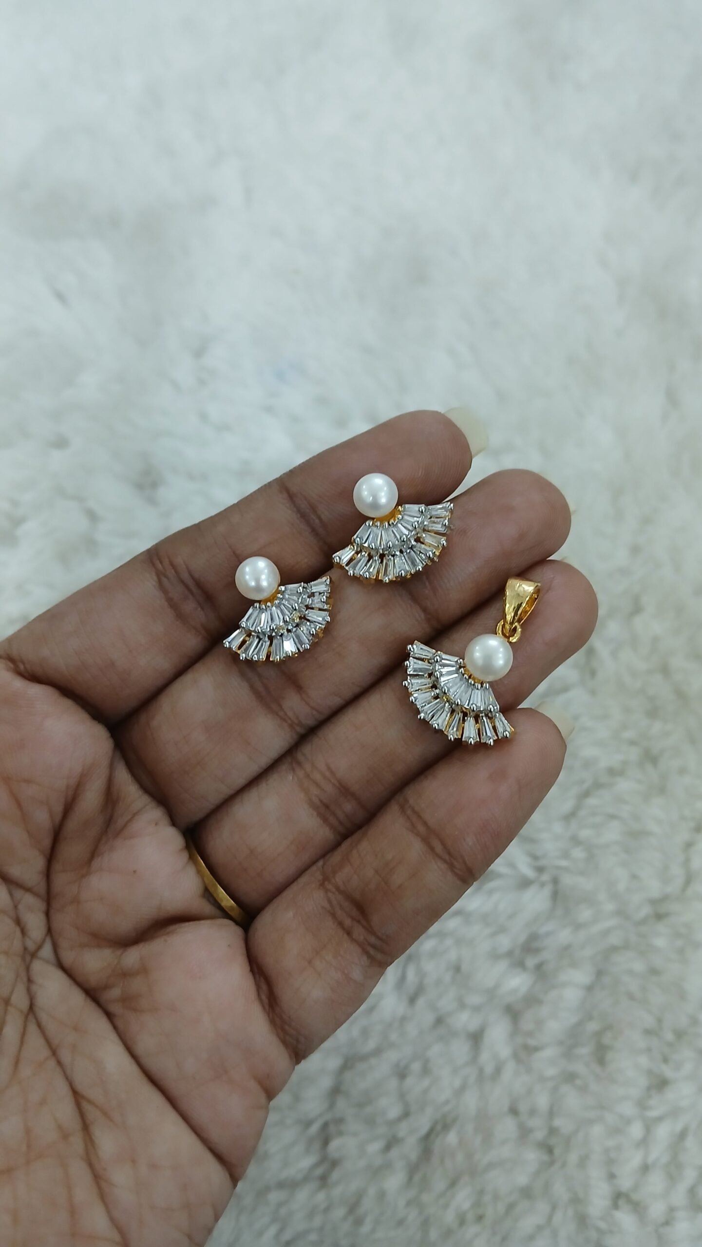 Be the first to review “Rays pattern Diamond copy pendant and earrings with real pearls” Cancel reply