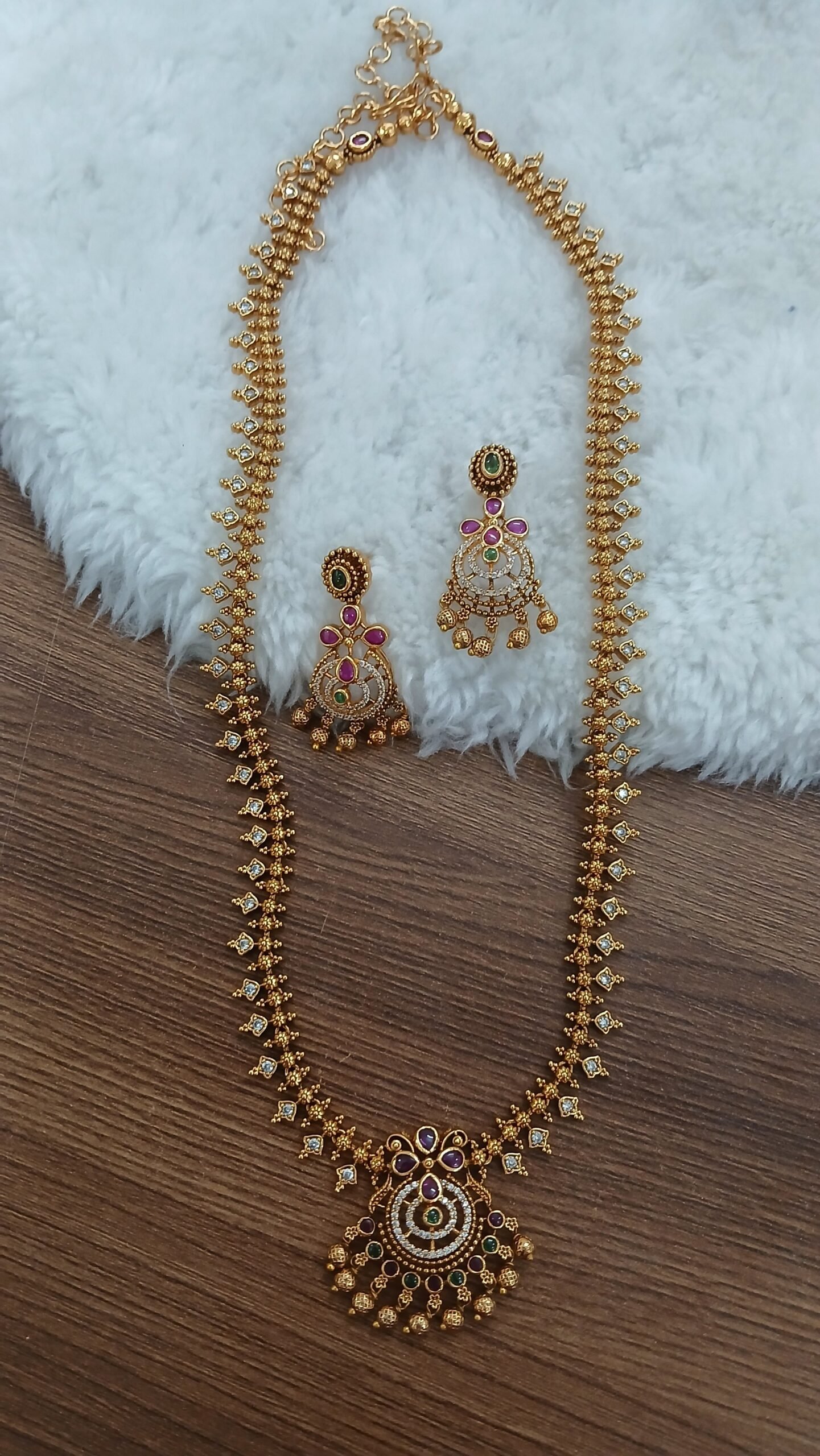 Be the first to review “Simple Long nakshi chain with earrings ( Multi stones )” Cancel reply